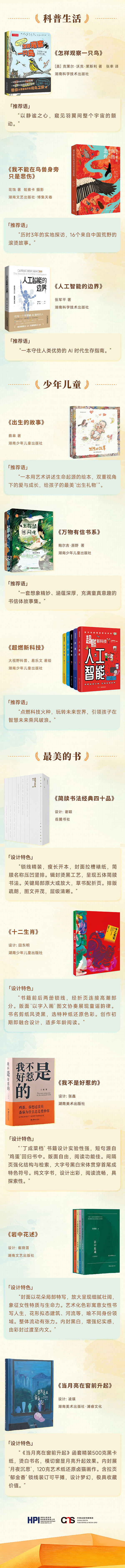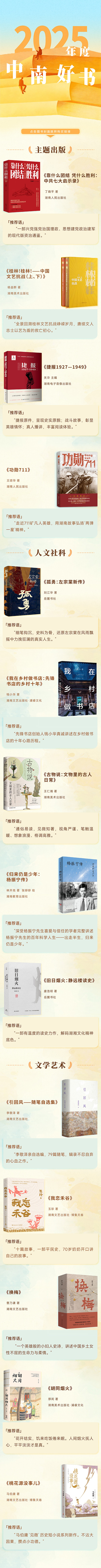 在此次入選的“中南好書”里,我們既見選題之奇、立意之新,也見筆墨之精、編校之勤?!豆鹆?桂林!——中國文藝抗戰》《捷報1927—1949》以別樣眼光回望烽火歲月,寫盡家國不屈的骨氣與韌勁;《靠什么團結 憑什么勝利:中共七大啟示錄》《功勛711》把歷史的光影凝成篇章,邀讀者與偉大再度相逢?!豆掠拢鹤笞谔男聜鳌贰杜f日煙火》從另一側面照見湖湘風云人物,見其崢嶸亦見其溫度;《換梅》《我戀禾谷》在平常日子里拾取可愛可敬,寫出人間煙火與心中清歡;《人工智能的邊界》為智能浪潮立下思辨坐標,給出AI時代的生存指引;《我不能在鳥獸身旁只是悲傷》牽我們步入無垠曠野,聽萬類生靈同聲共息;《歸來仍是少年:楊振寧傳》的率真天成、《引回風》的清逸流轉、《萬物有信書系》的童趣鮮活……二十冊書就是二十扇窗,一頁開新境,一卷見遠方——引人走向未知,卻處處精彩。