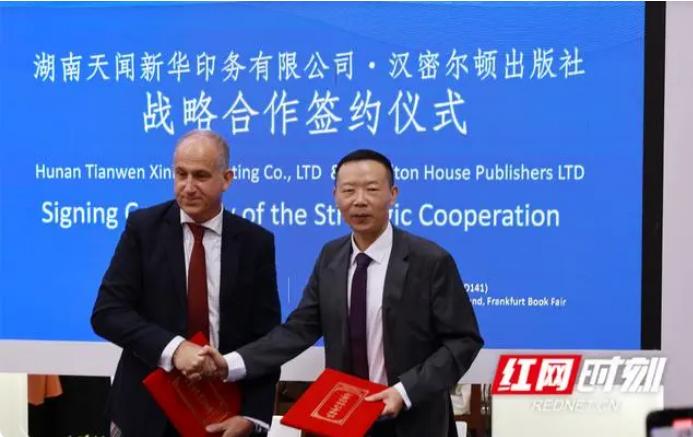 當(dāng)天,湖南天聞新華印務(wù)有限公司與希臘漢密爾頓出版社舉行戰(zhàn)略合作簽約儀式。此次戰(zhàn)略合作,標(biāo)志著未來在全球市場中,雙方將在資源共享、技術(shù)合作等方面展開更加緊密的合作,開啟精品印務(wù)全球合作新篇章。